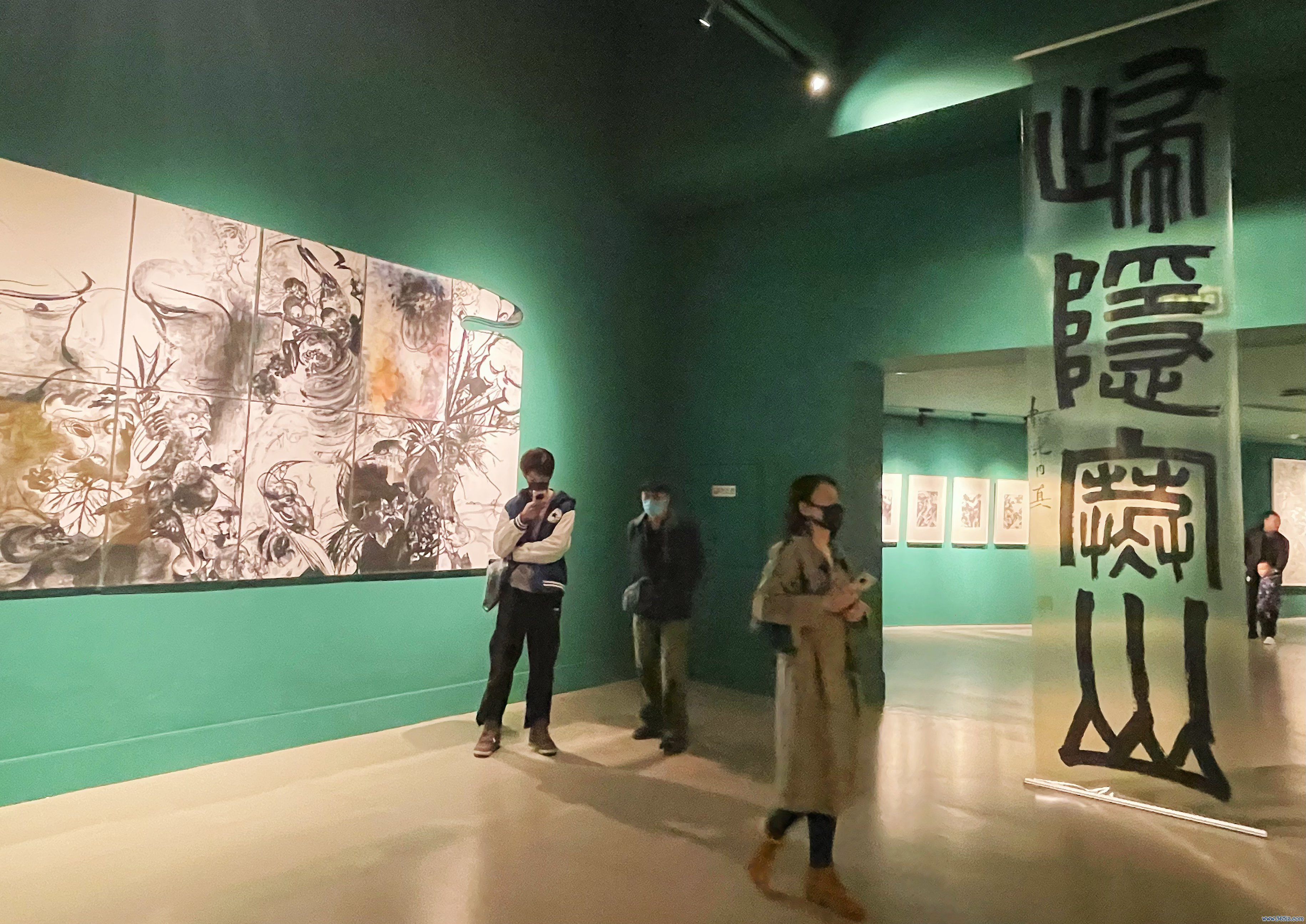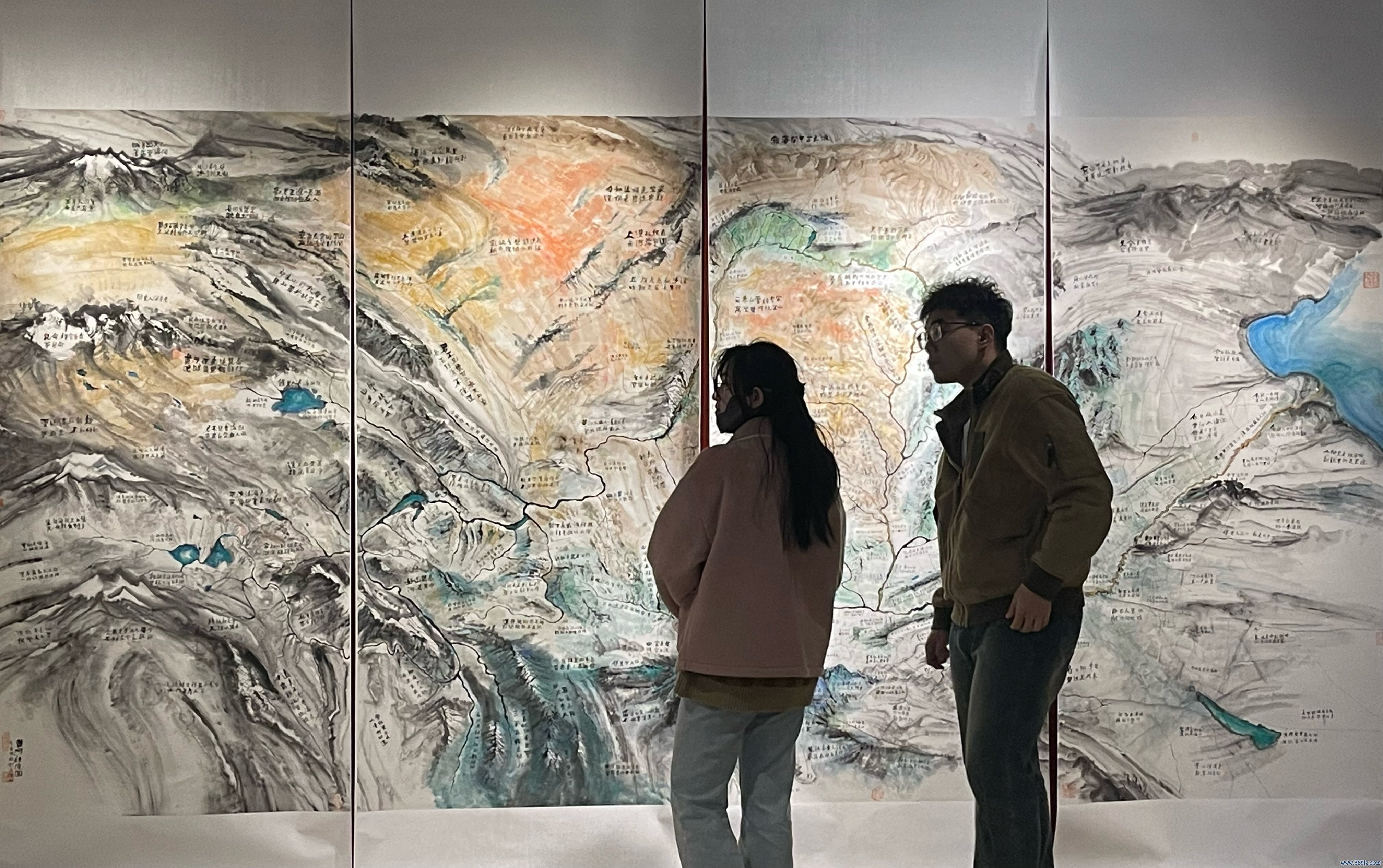 参加展厅,首入眼帘的是中国好意思术学院闵学林锻练与中央好意思术学院邱志杰锻练带来的两组作品。两位艺术家一南一北跨地域碰撞,在合并展厅献技翰墨对话。闵学林创作的《忆秦娥·娄山关》《飞雨楼诗》及《苏子由诗》三幅书道作品,翰墨舒坦淋漓。邱志杰创作的《黄河诗境图》参照实在的黄河流域地貌,将山川湖海以及黄河全域再现于画面之上,同期将历史上对于黄河的诗篇标注在其形容的地点之上。