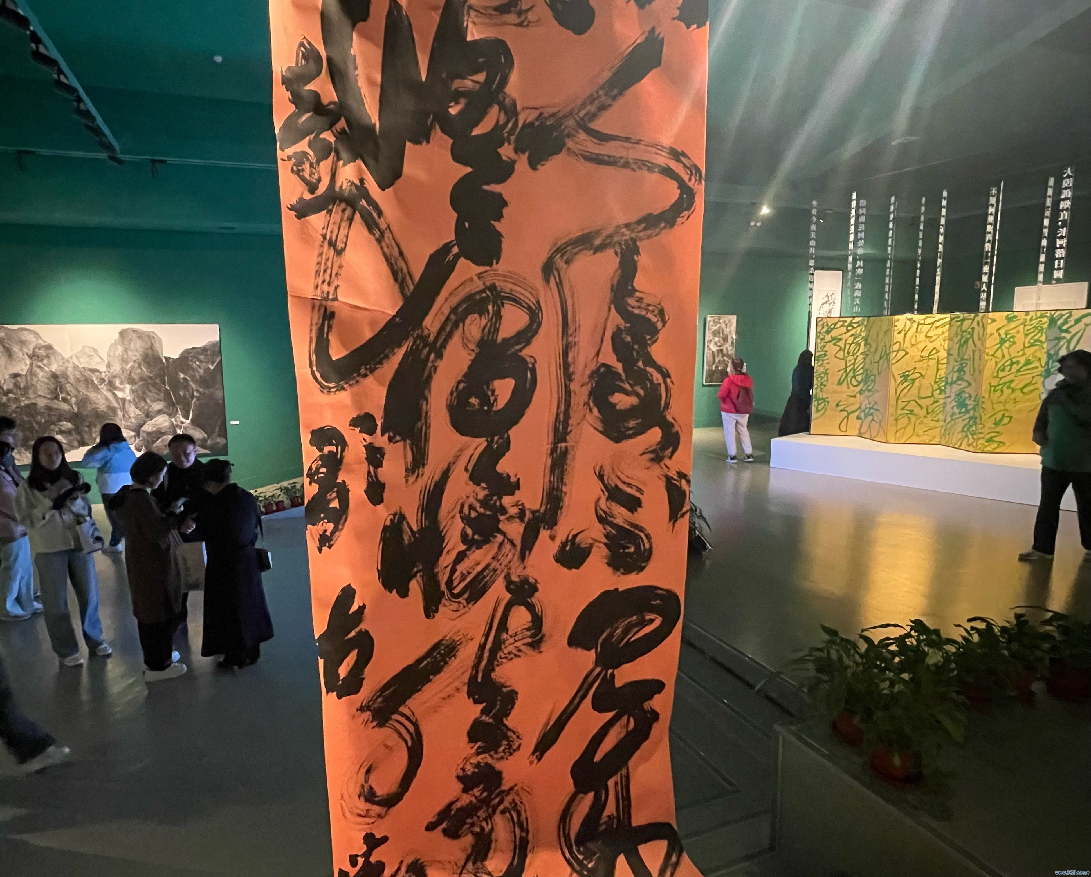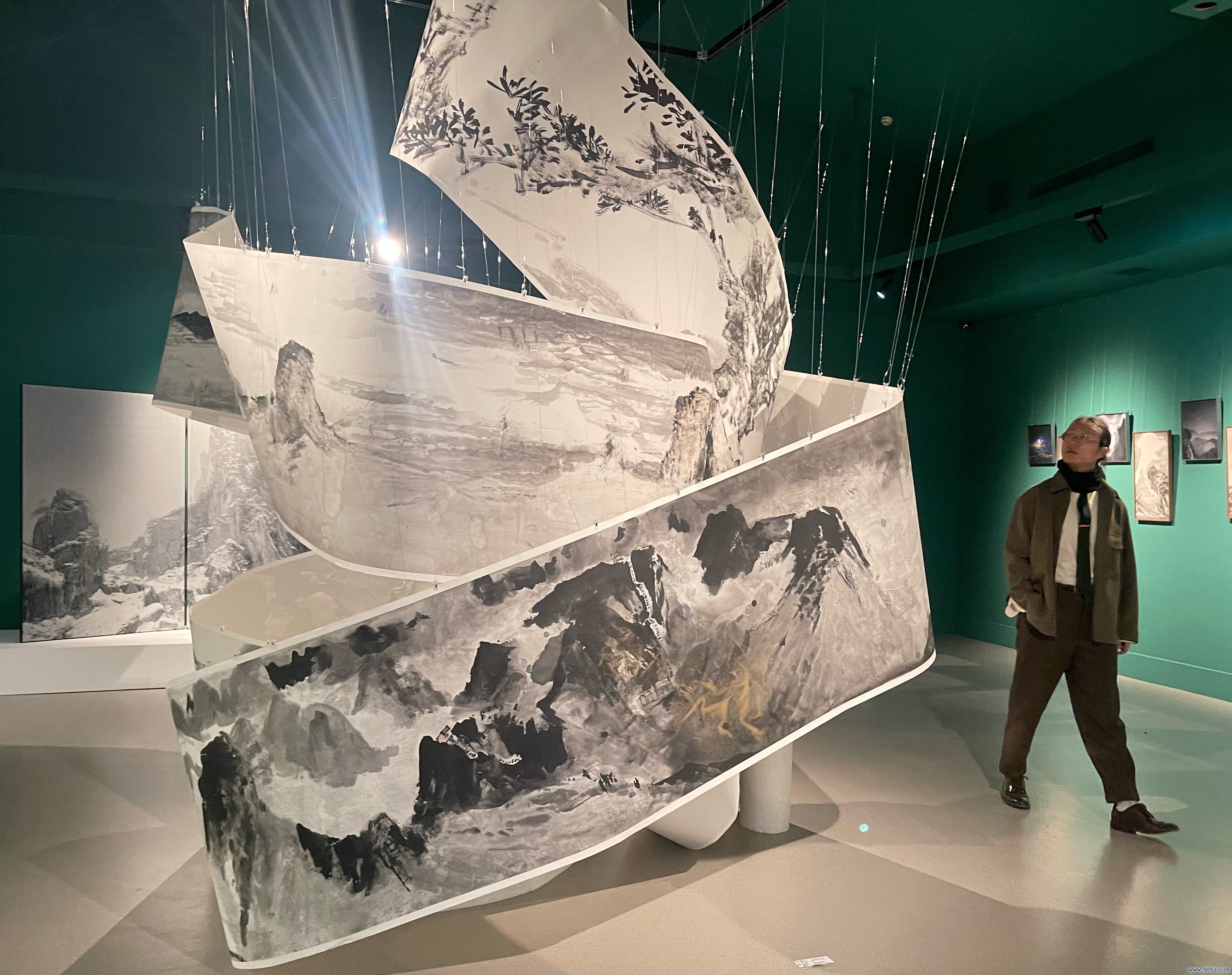 在临了一个展厅中,一件高高悬起,盘旋而落的30米长卷作品尤为拉风。这件作品全长100米,由中国好意思术学院刘海勇锻练带队的敦煌行走艺术家团队在沙漠中共同创作完成,墨色中朦拢可见五色敦煌沙砾附着其上。这次展览展出了其中精选的30米画面,包括奇峻的三危山、平远的黑戈壁、摇曳在风沙中的树木植被等。展览由中国好意思术学院和数字电视字画频说念主理,将在北京展出至11月21日。
